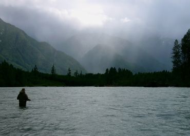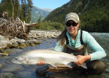 The Dean River begins as a small stream high in the swamps of the Chilcotin plateau of British Columbia's interior. It flows north through the well-known wild Rainbow trout fishing area around Nimpo and Anahim Lakes then turns westward at Anahim Peak and begins it's turbulent descent to the Pacific Ocean. Natural barriers in this middle section concentrate a large summer run of Steelhead (sea run Rainbow trout) in the lower reaches of the river from June through September. A canyon near the mouth of the river keeps the weaker salmon out of the system. Only Steelhead, Chinook and Coho get through in significant numbers. Chinook Salmon enter the river through June and July and Coho Salmon enter late August through September. The Dean is a dry fly paradise for steelhead from the day it opens to October 1, the day the river closes. |